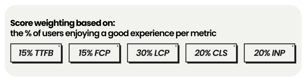 TTFB (15%): Captures the server-side dimension. Although not immediately visible, it directly influences FCP, LCP and perceived speed, and also has an impact on SEO and crawl efficiency.