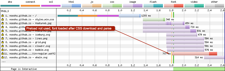 Dans la deuxième image, le navigateur télécharge la police après le téléchargement et l’analyse des fichiers HTML et CSS. C’est seulement à ce stade que la requête pour la police au format WOFF2 peut être faite. Ainsi, lorsque preload n’est pas utilisé, la police se trouve dans la requête 11. J’ai écrit davantage sur le préchargement de police ici.