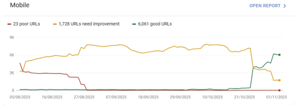 - Des urls rapides dans le CrUX : Grâce à une meilleure priorisation des scripts externes, jusqu’à 85% d’amélioration du nombre d’URLs considérées comme rapides dans la Search Console a été observée.